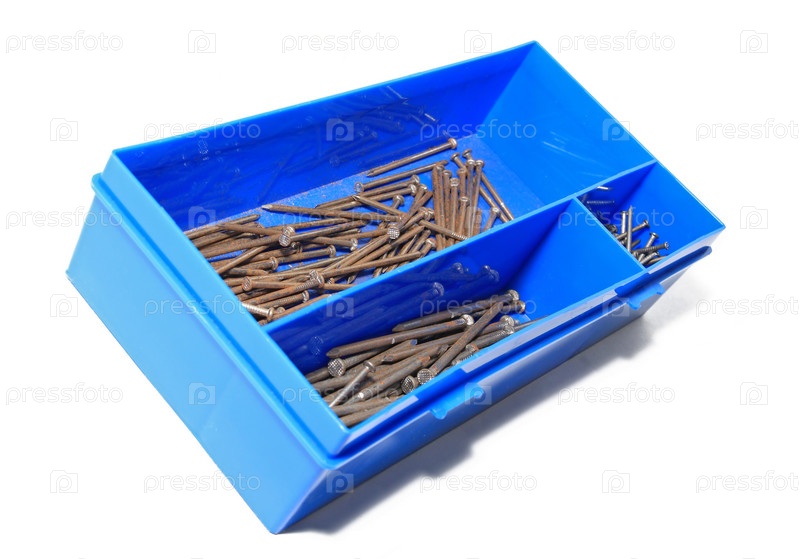 Гвозди в голубой пластиковой коробке