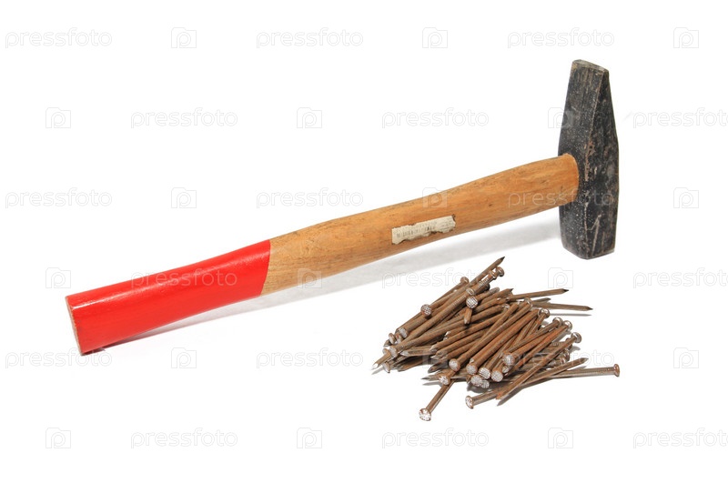 Молоток и гвозди на белом фоне