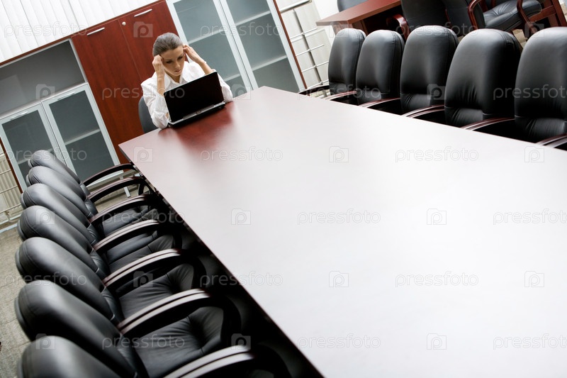 Деловая девушка сидит в зале для совещаний и серьезно продумавает свой доклад
