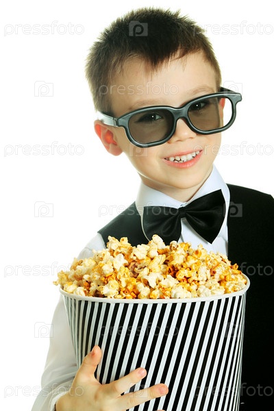 Мальчик в очках с попкорном на белом фоне
