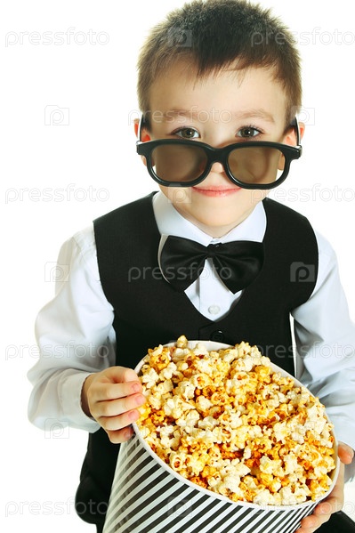 Мальчик в очках с попкорном на белом фоне