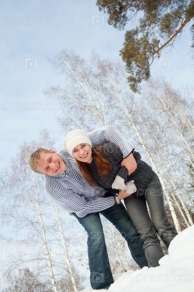 Счастливый мужчина и женщина на улице зимой