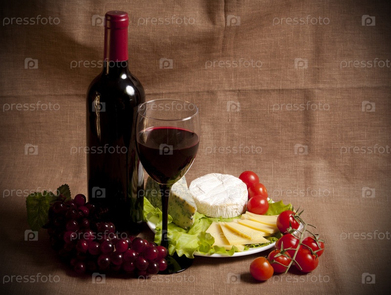 Бутылка вина, виноград, сыр и помидоры