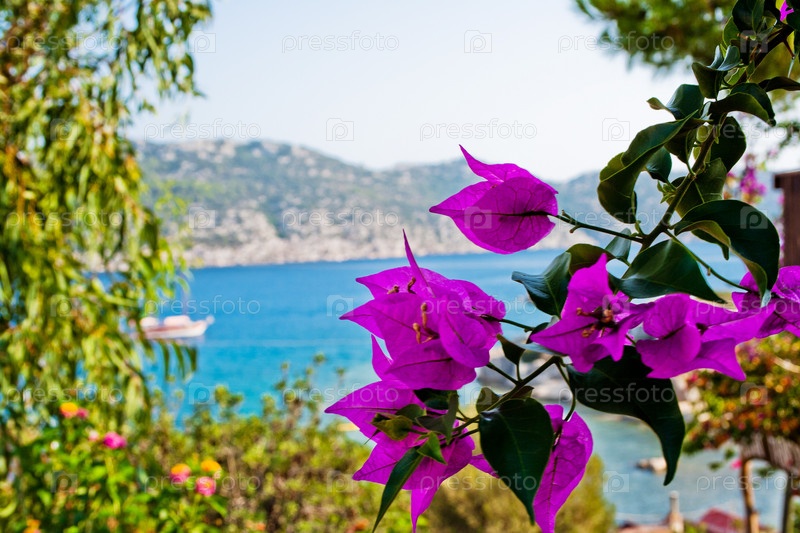 Розовые цветы на фоне Средиземного моря