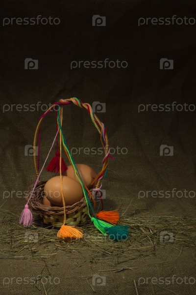 Яйца в корзине на темном фоне