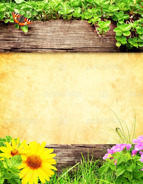 Летний фон со старыми деревянными досками, травой и зелеными листьями