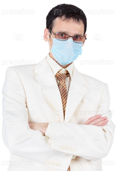 Бизнесмен в стерильной медицинской маске на белом фоне