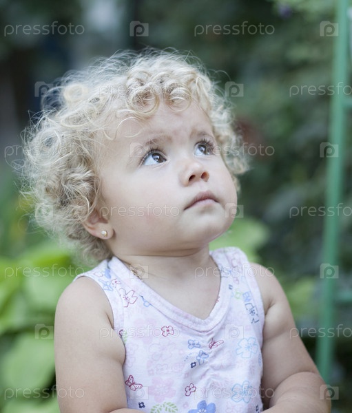 Маленькая девочка в белом платье смотрит вверх