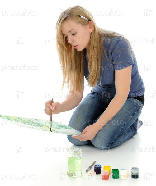 Блондинка в голубой футболке рисоует, сидя на полу