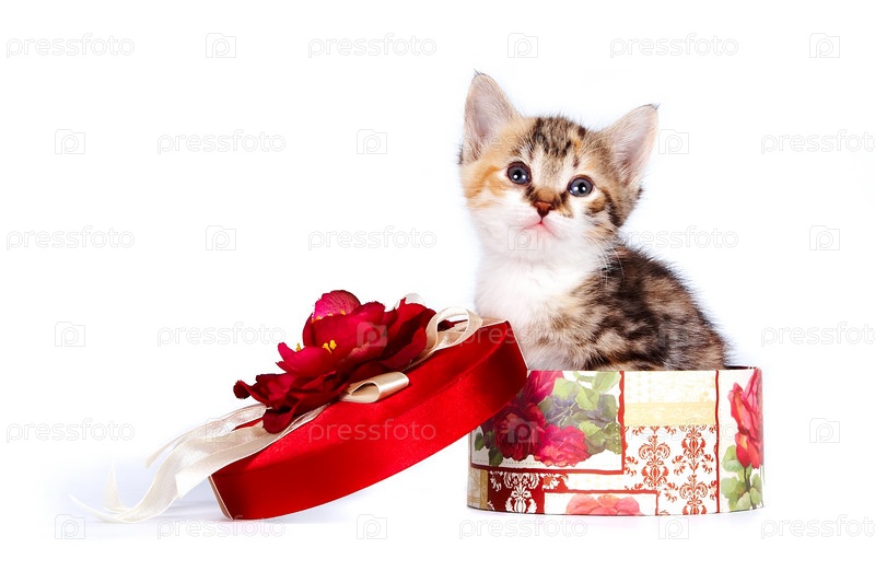 Котенок в подарочной упаковке на белом фоне