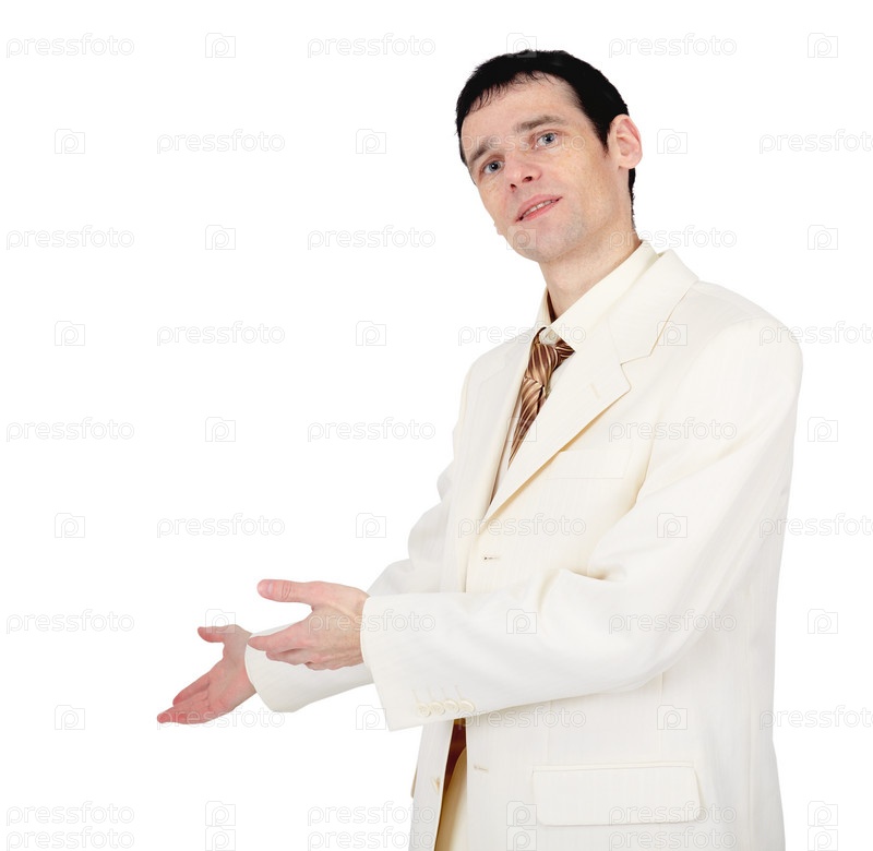 Молодой человек в белом костюме приглашает
