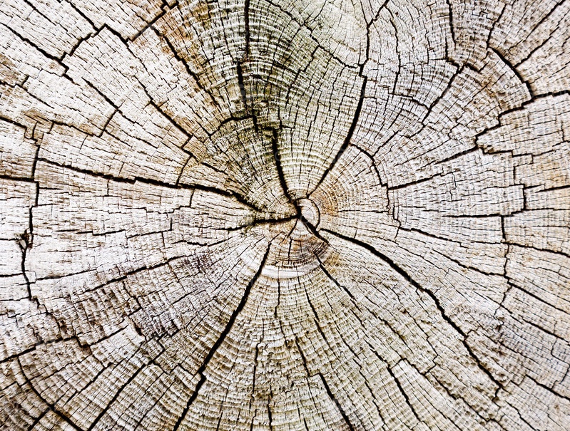 Торец старого гнилого деревянного бревна с трещинами