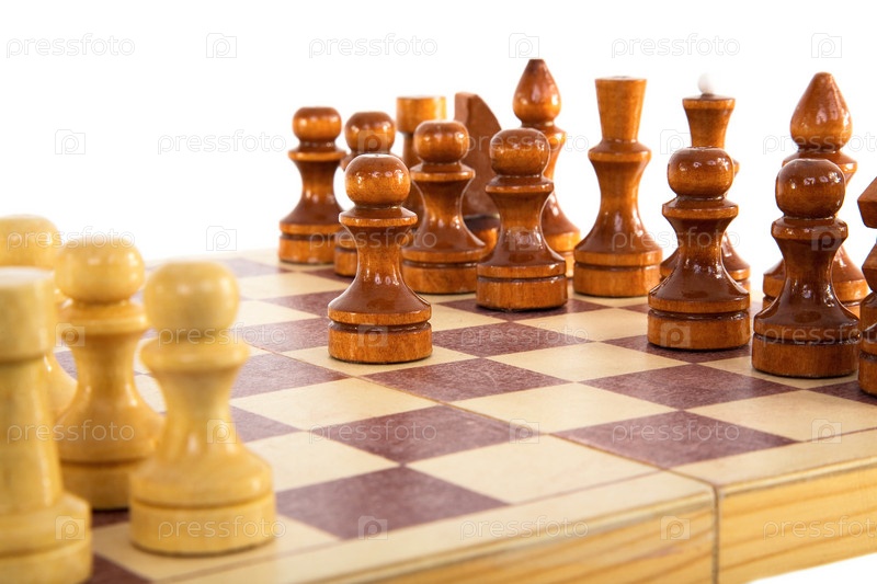 Деревянные шахматные фигуры на доске изолированы на белом фоне