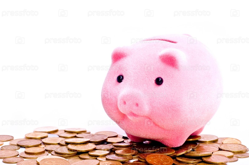 Розовая свинья-копилка на монетах