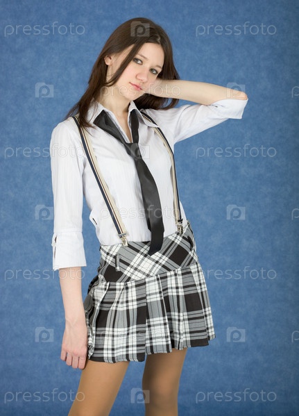 Молодая женщина в юбке на синем фоне