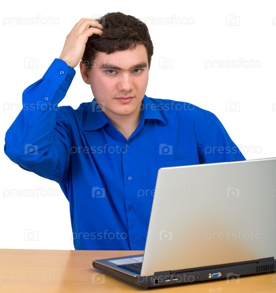 Молодой человек расчесывает голову, сидя за ноутбуком на белом