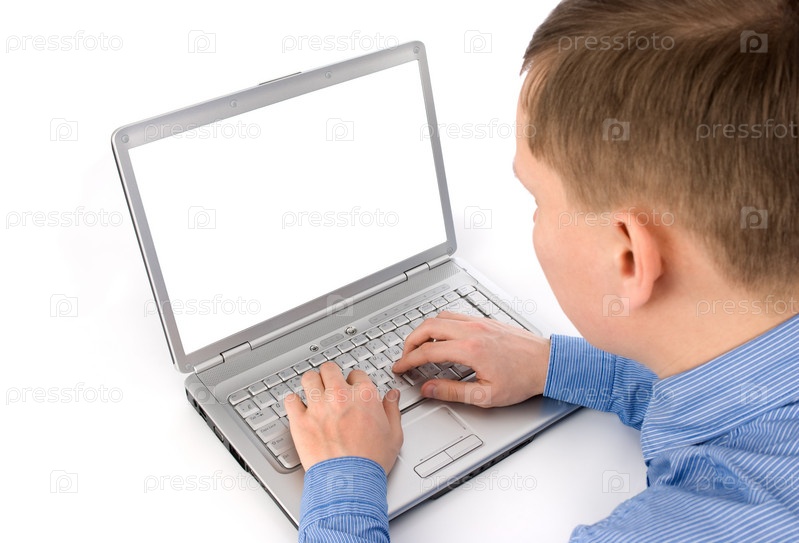 Задний вид молодого человека, работающего с ноутбуком