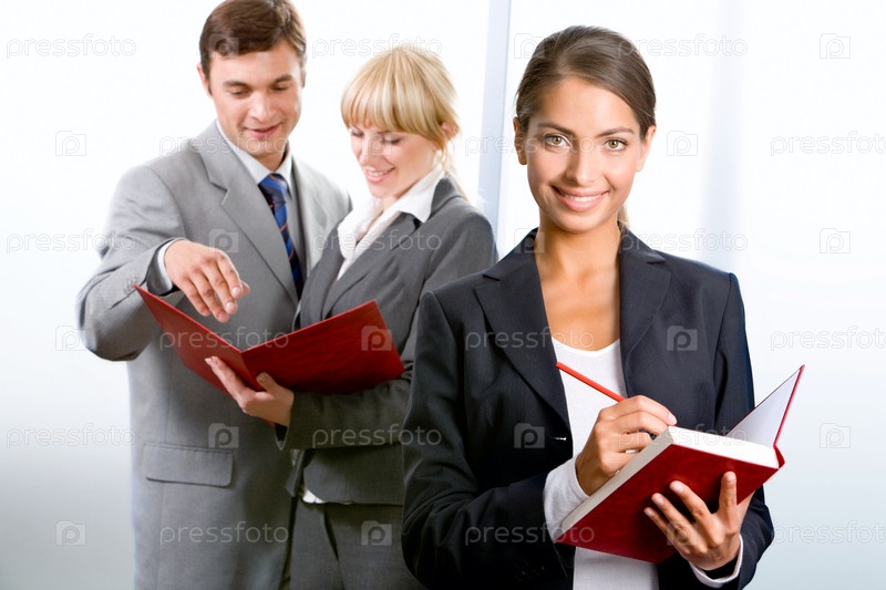 Деловая девушка с красным ежедневником на фоне общающихся бизнесменов