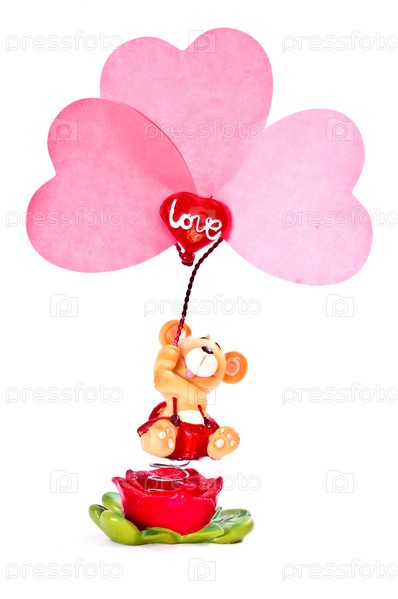 Маленькая игрушка держит в руках розовое сердце, изолированное на белом