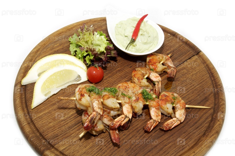 Деревянная тарелка с креветками и соусом