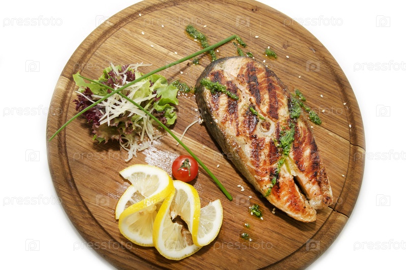 Рыба, жареная на гриле, на деревянной тарелке