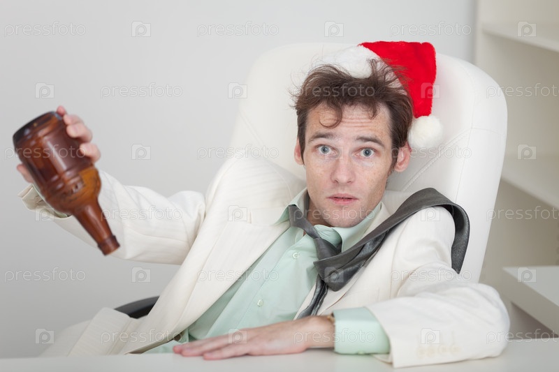 Молодой человек в полном опьянении с перевернутой бутылкой в рождественской шляпе праздновал Рождество в офисе