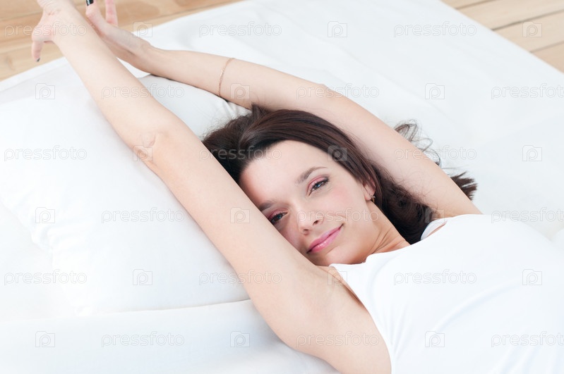 Молодая привлекательная девушка потягивается в постели