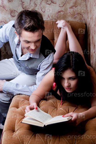 Молодая пара читает книгу на декоративном диване