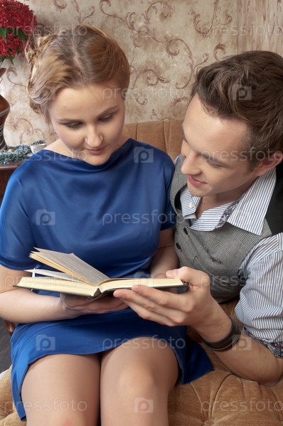 Молодая пара читает книгу на декоративном диване
