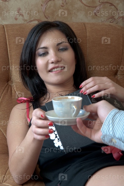 Мужчина подает чашечку кофе девушке, которая лежит на декорированном диване