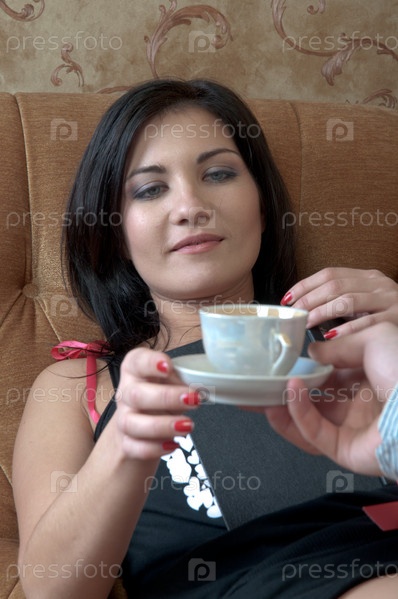 Мужчина подает чашечку кофе очаровательной молодой девушке