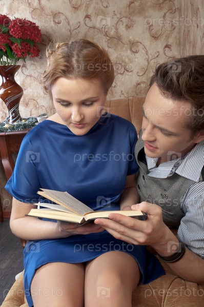 Молодая и красивая пара читает книгу, сидя на декоративном диване