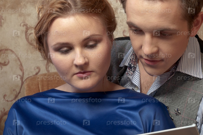 Молодая и красивая пара читает книгу, сидя на декоративном диване