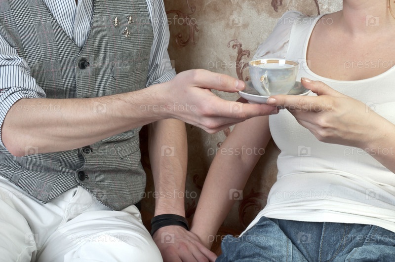 Мужчина подает чашечку кофе молодой девушке