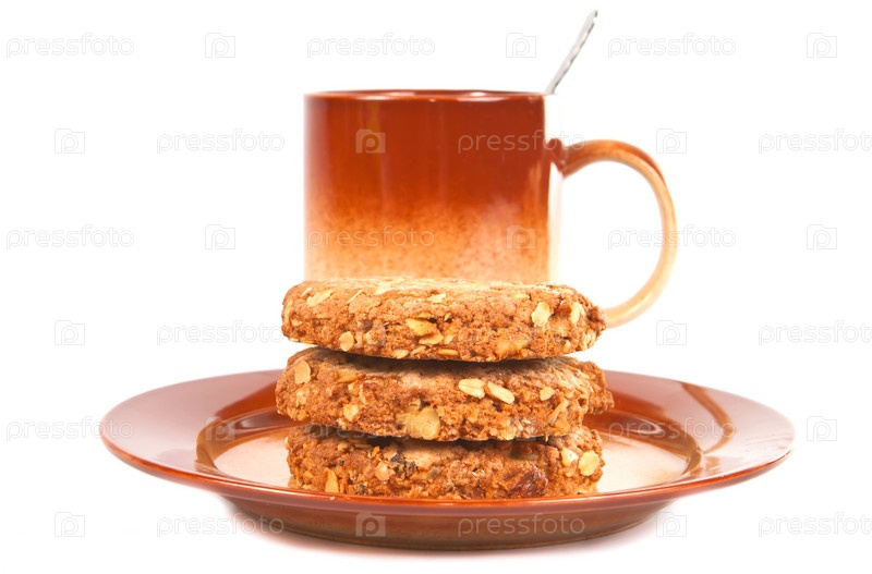 Овсяное печенье с арахисом на тарелке и кружка чая на белом фоне