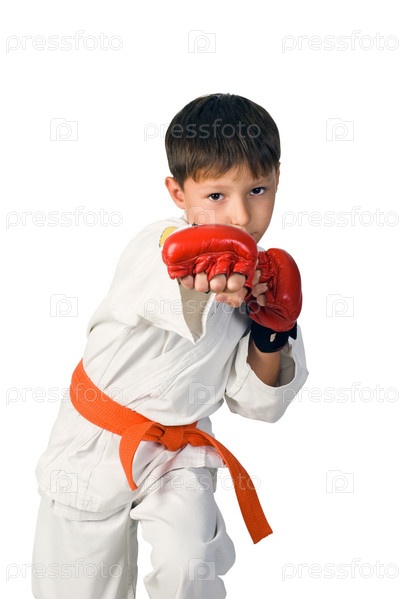 Мальчик занимается айкидо в белом кимоно, изолированный на белом фоне