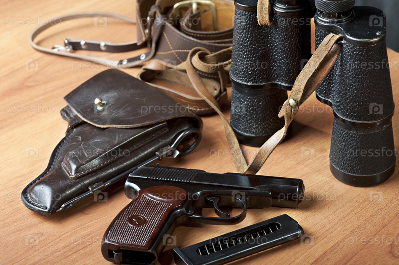 Пистолет Макарова, кобура, пояс, бинокль и обойма на столе