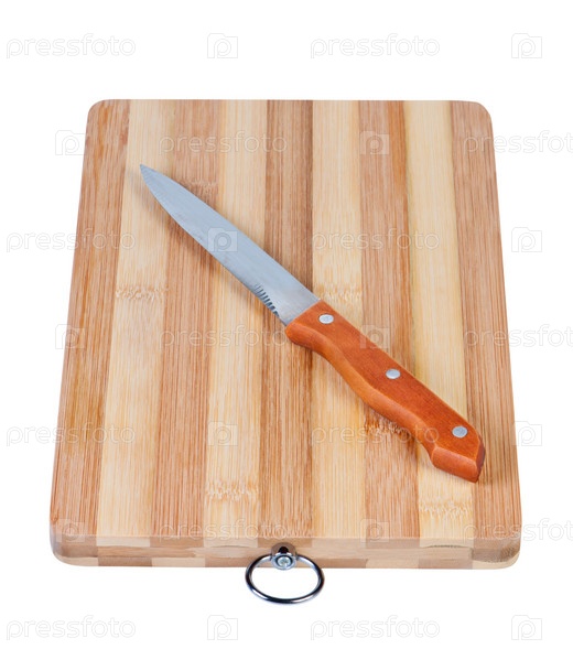 Бамбуковая разделочная доска с кухонным ножом, изолировано на белом фоне
