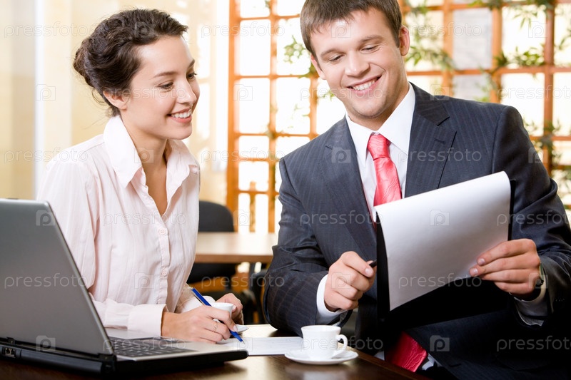 Бизнесмен показывает результаты работы деловой девушке в офисе