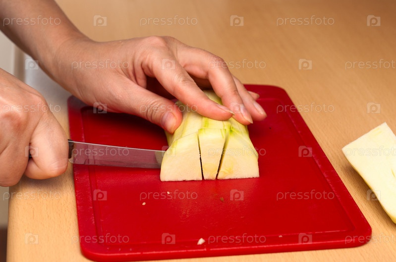 Баклажаны режут ножом на красной доске