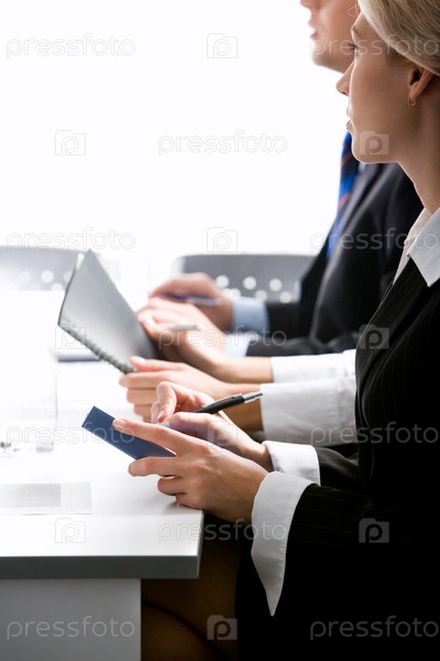 Молодые предприниматели сидят с ручками и конспектами на семинаре по бизнесу