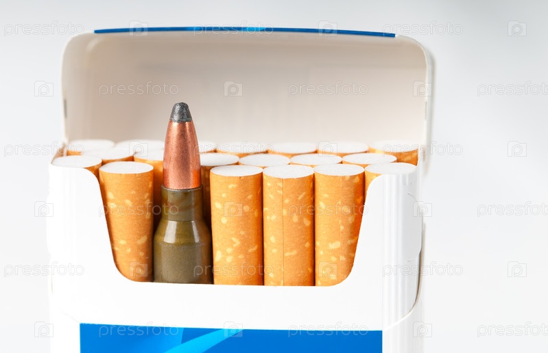 Открытая пачка сигарет с фильтром и пулеметный патрон