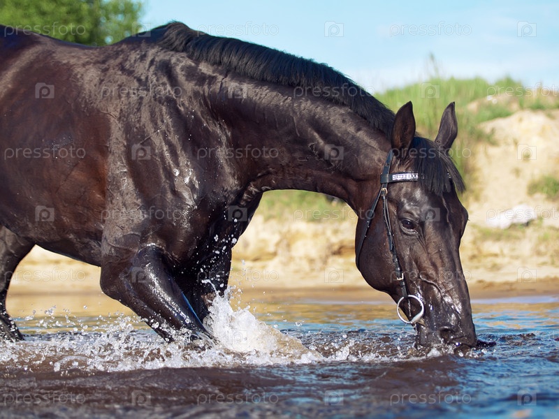 Черный жеребец купается в озере
