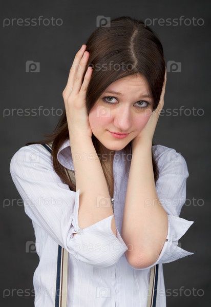 Портрет красивой молодой девушки на черном фоне с закрытыми ладонями и ушами