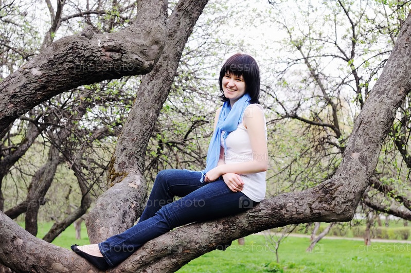 Молодая девушка, сидящая на дереве