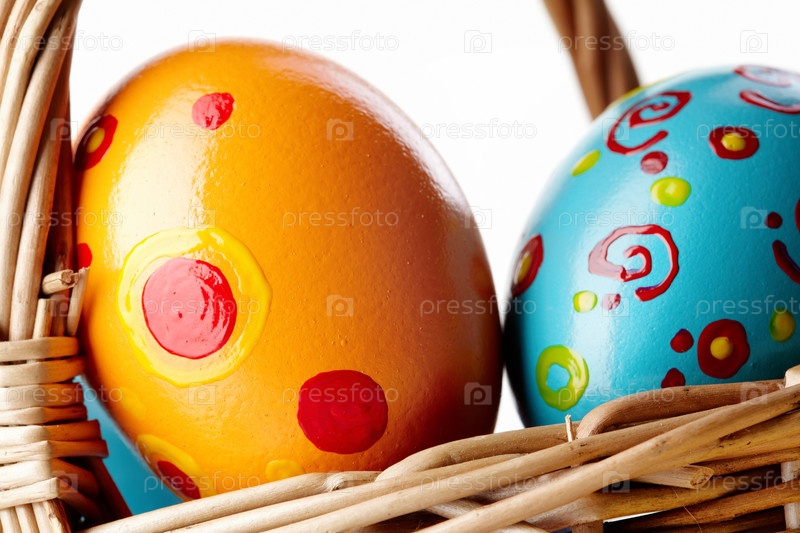 Корзинка с пасхальными яйцами на белом фоне