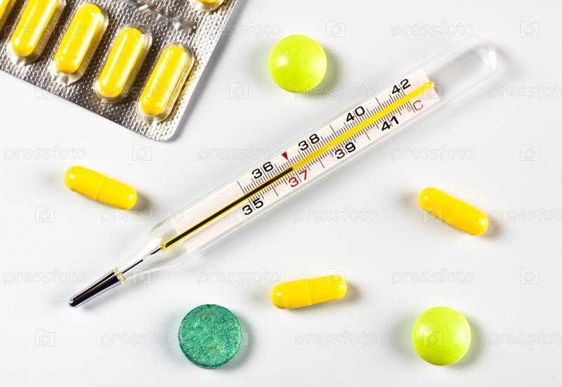 Термометр и таблетки на сером фоне