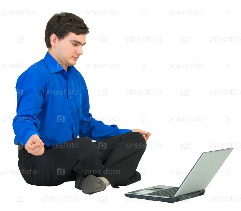 Молодой парень сидит на белом фоне в позе лотоса с ноутбуком