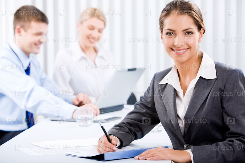 Портрет счастливой деловой женщины, сидящей за столом на фоне ее коллег