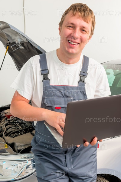Счастливой механик с ноутбуком возле автомобиля